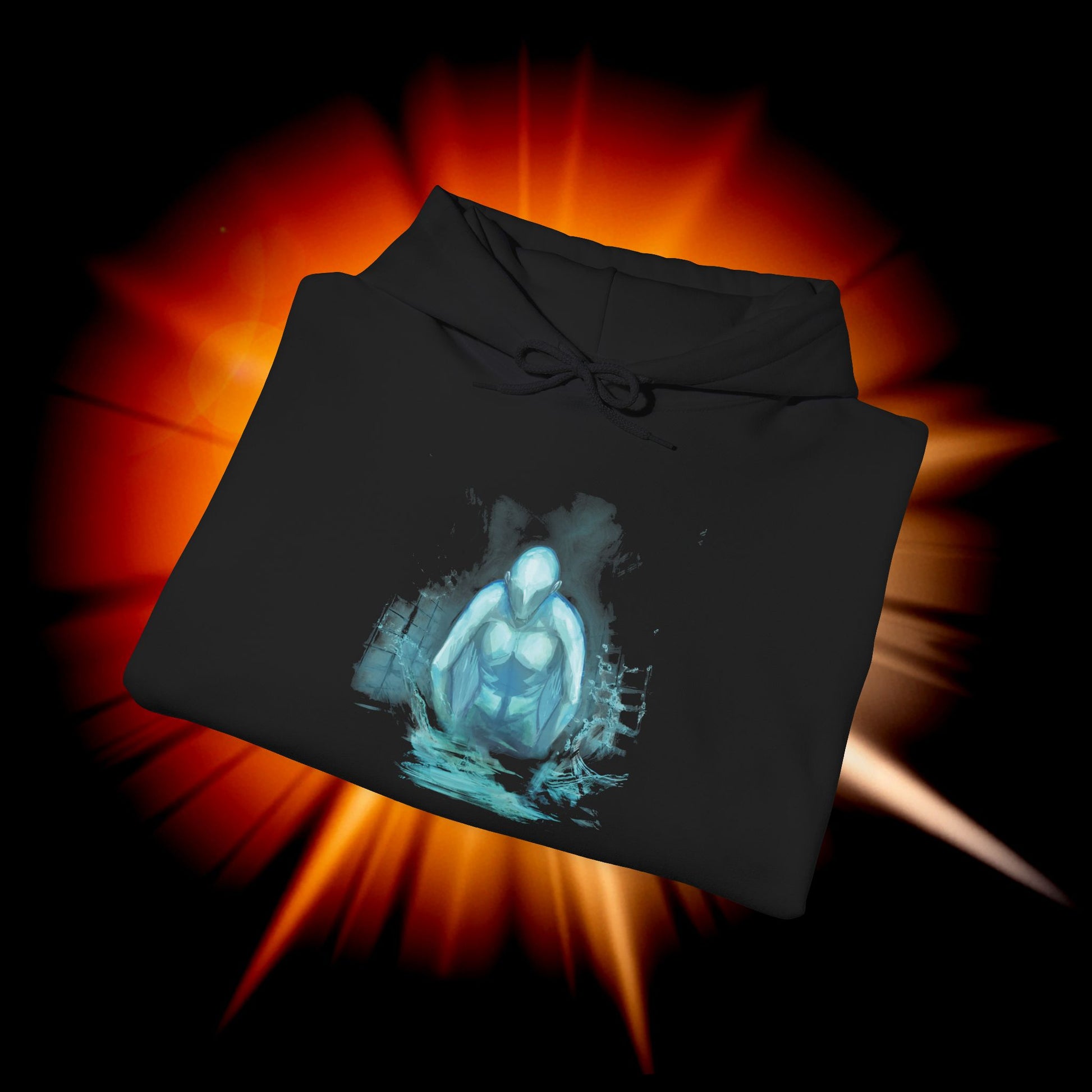Soft, slightly oversized fleece that feels like an evening by the lake. The black hoodie carries a cool, glowing illustration on the chest — a serene, lantern-like figure reflected on rippling water — with matching icy-blue lettering down one sleeve. It settles into quiet routines: pulled up on chilly walks, layered for late-night studio work, or worn on low-key meetups with friends who get that subtle, moody vibe. Breathable yet warm, the fabric keeps its shape while the roomy kangaroo pocket and double-lined hood add everyday comfort. The result is a wearable piece that whispers atmosphere rather than shouting it.